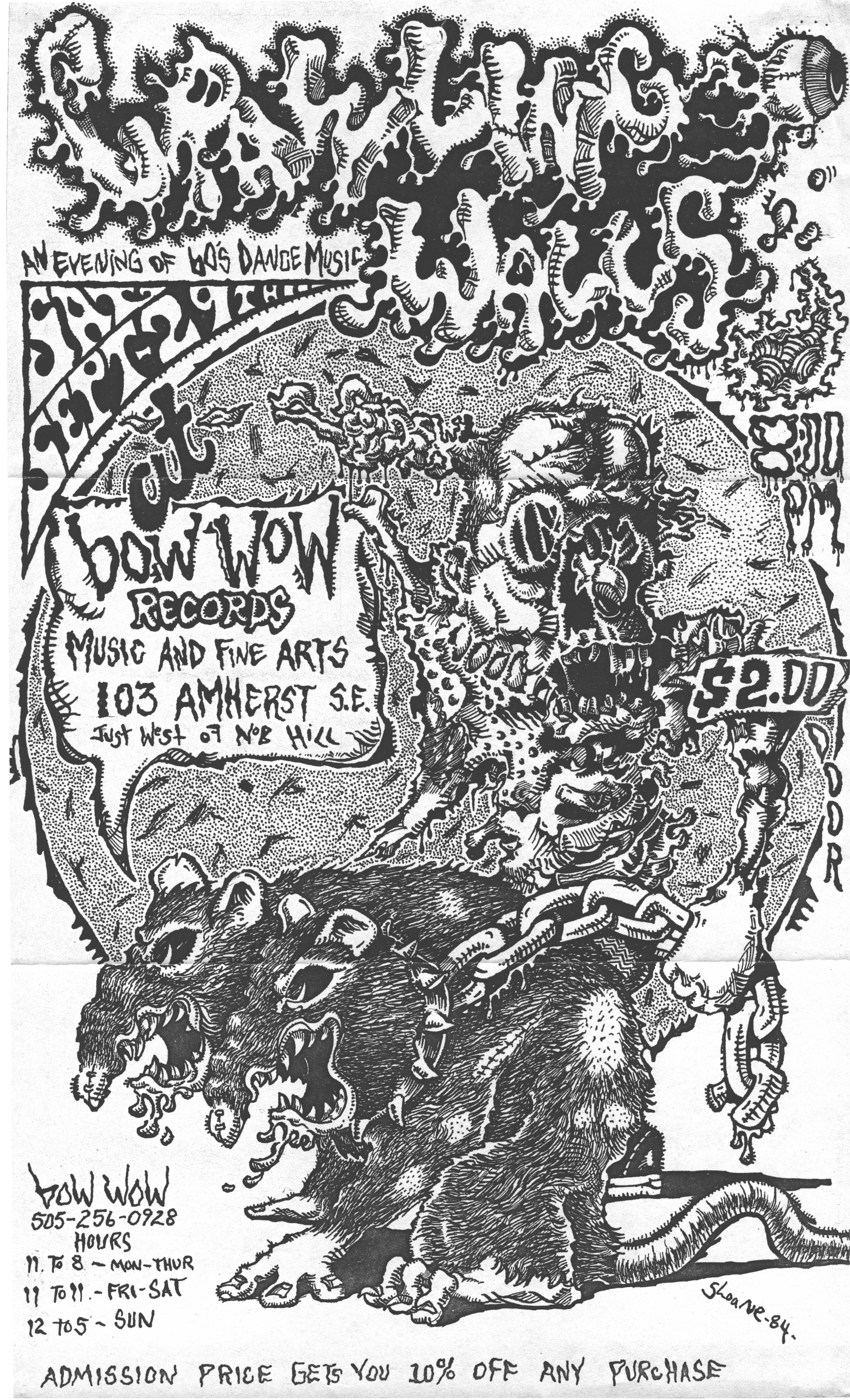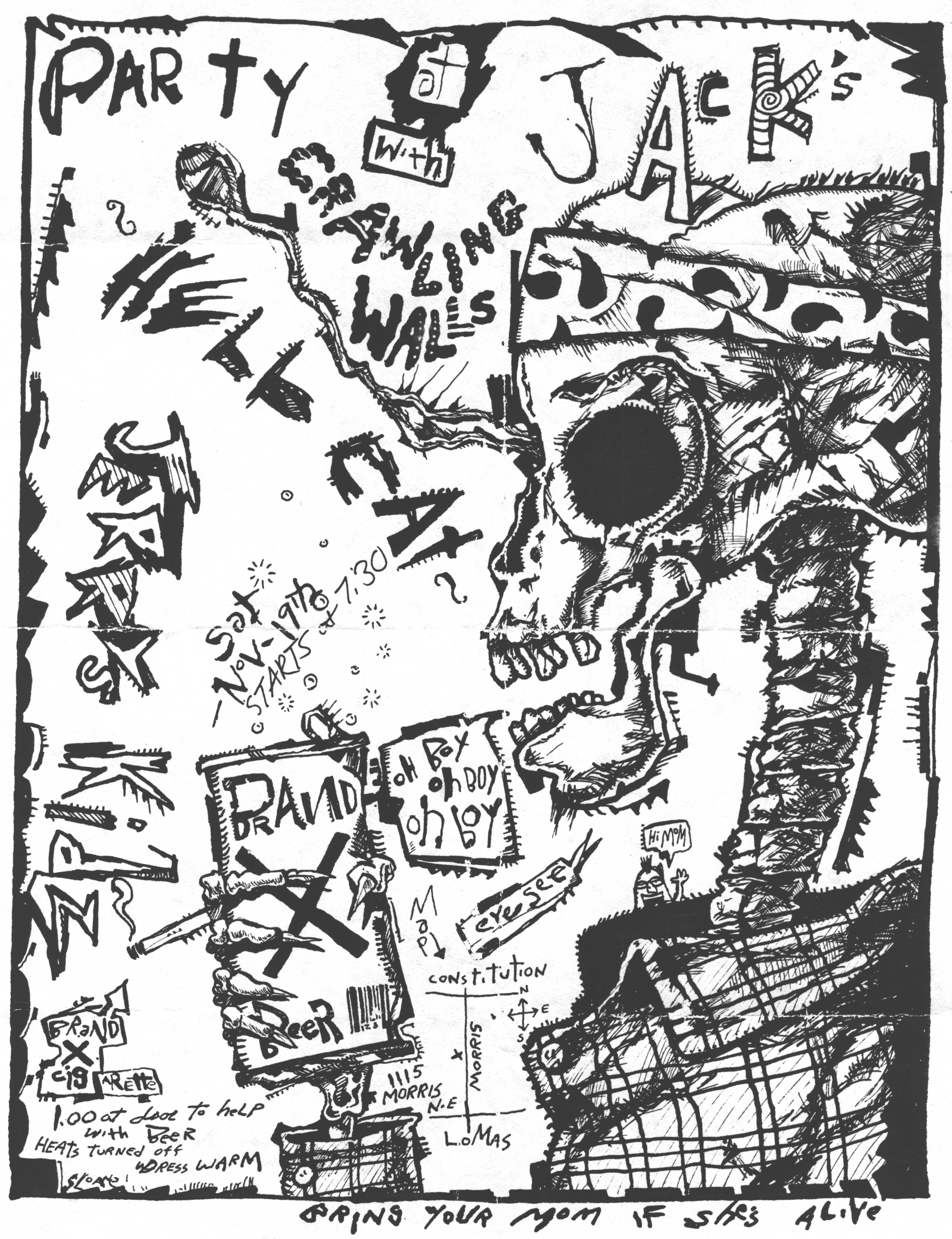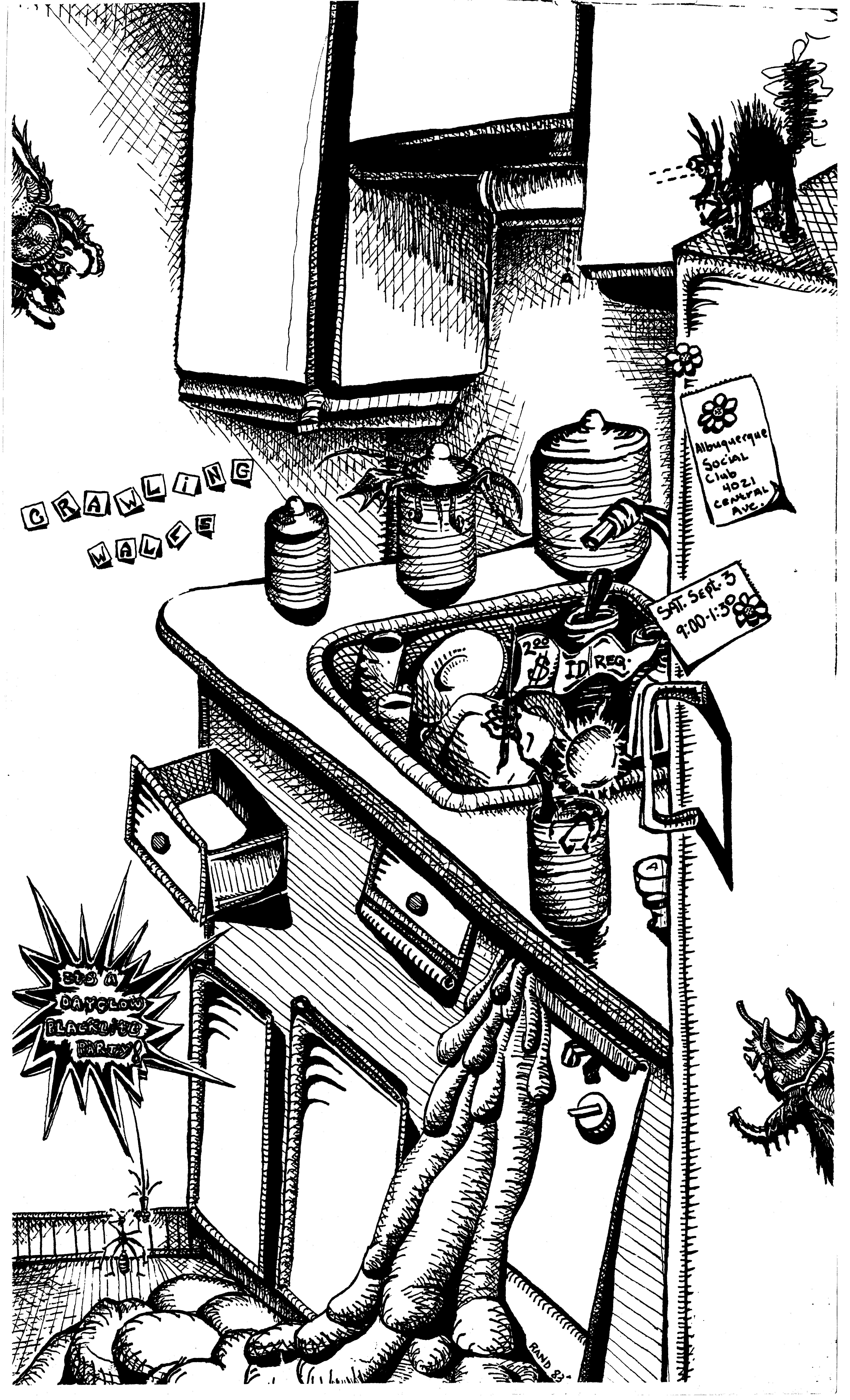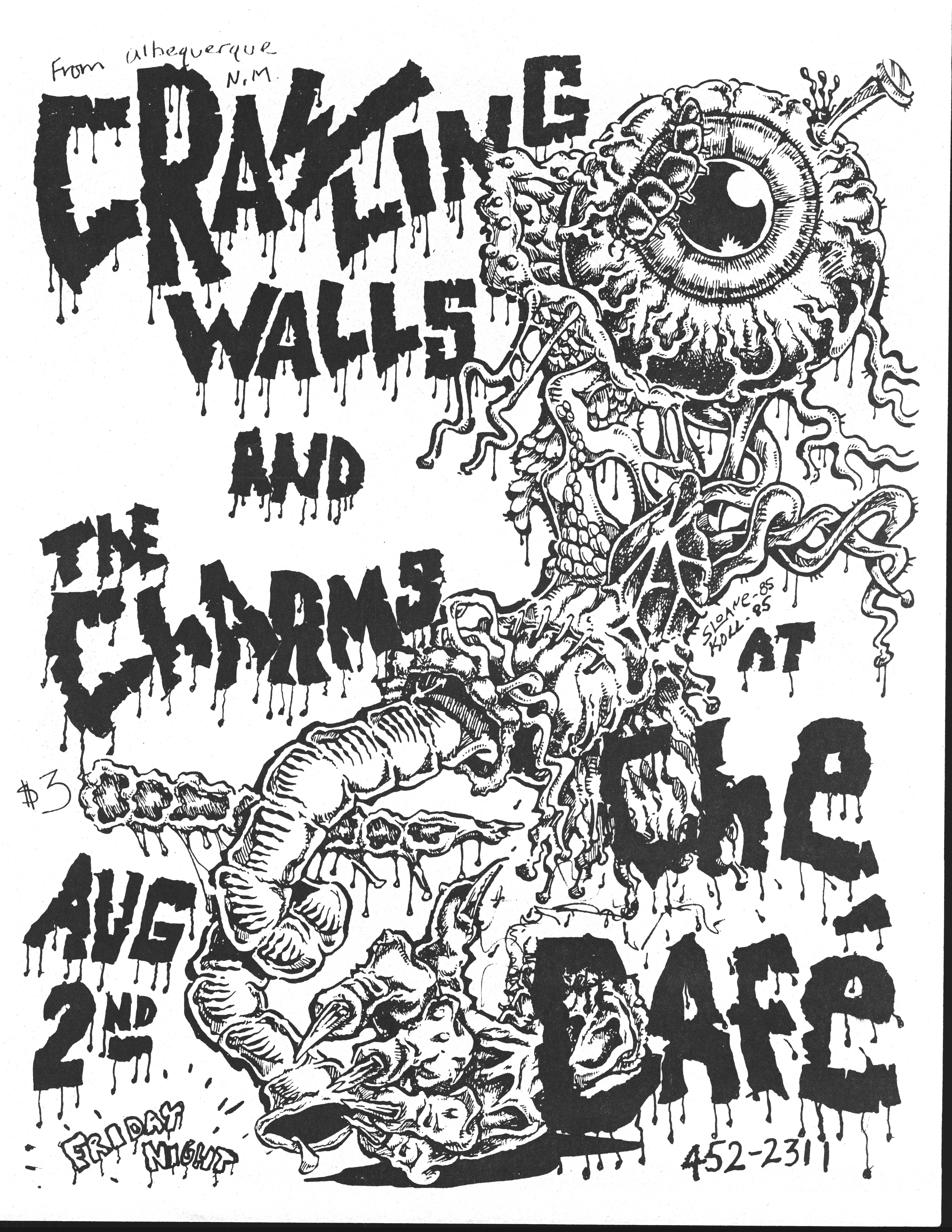 The show on October 20 with Plan 9 was one of the most memorable. They had left their home base in Rhode Island and were touring the country in a school bus that broke down in Kansas. They got it fixed and drove 12 hours straight, arriving after the Albuquerque show had already begun. No matter. They got there, and they were great! Afterward, they parked the bus in my driveway, and the 8 of them (they were touring with 4 guitars, bass, drums, keyboards, and vocals!) camped out at my house for a couple of days, long enough to stay for Hans' going-away party. They were amazed at the poster art that R.K. Sloane had done, and invited him to do the cover for "Dealing with the Dead," the album that they were working on, which pretty much launched Sloane's new career doing album art. He created cover art for 2 other Plan 9 albums, as well as several of the "Battle of the Garages" compilations, Roky Erickson's 1986 "Evil Hook Wildlife" single, and many others, including the skull and guns logo for the Guns N' Roses "Use Your Illusion I" album.