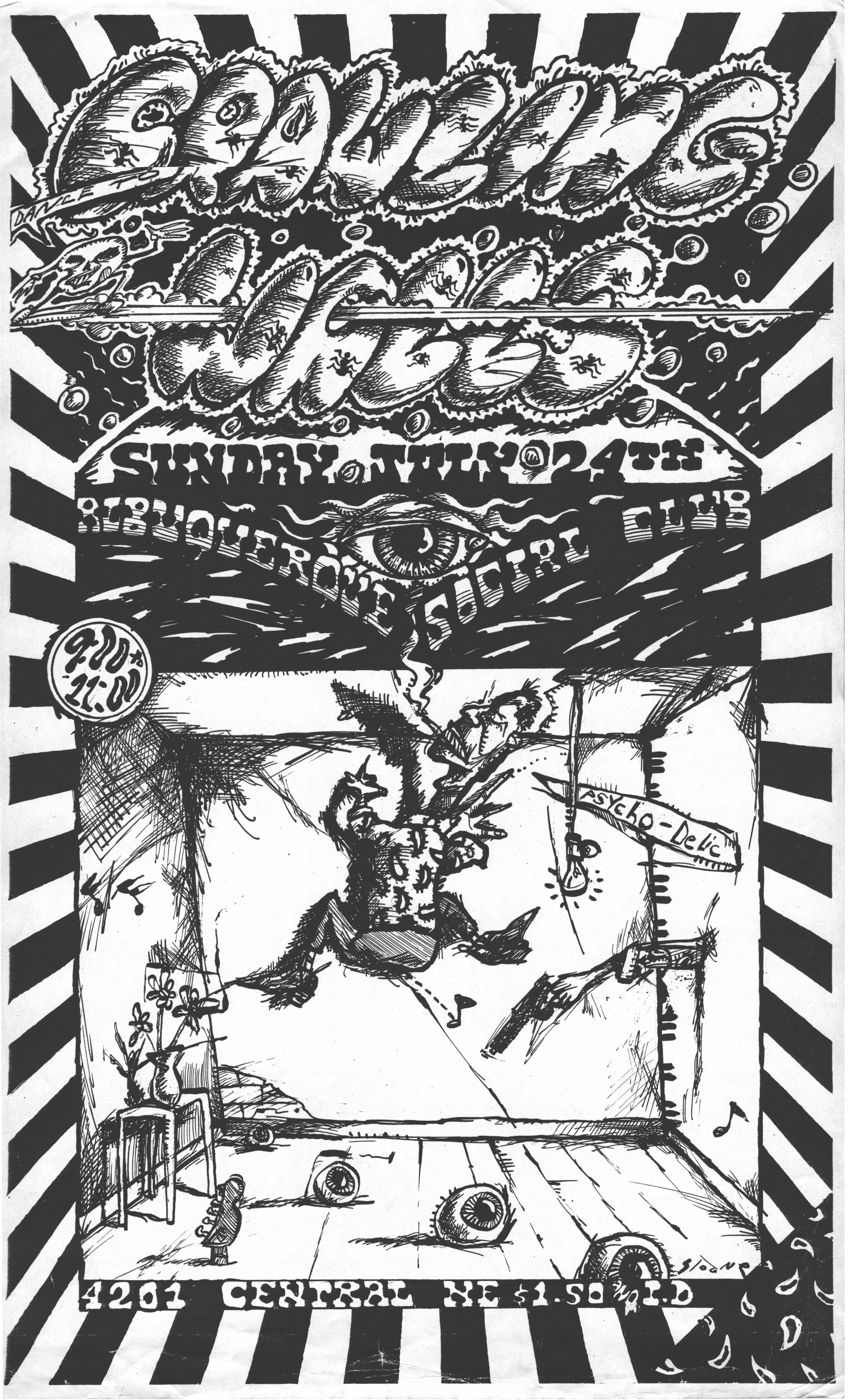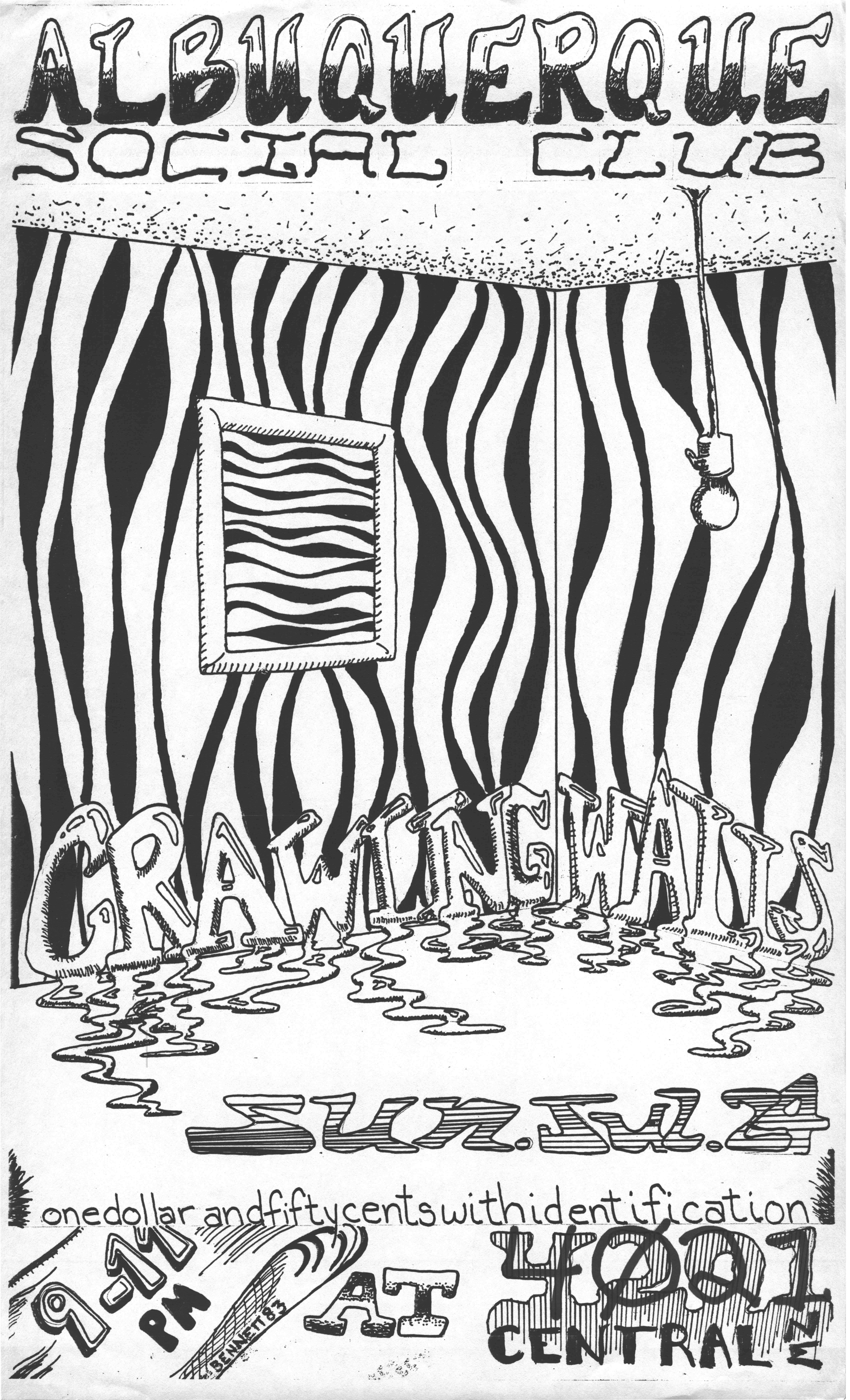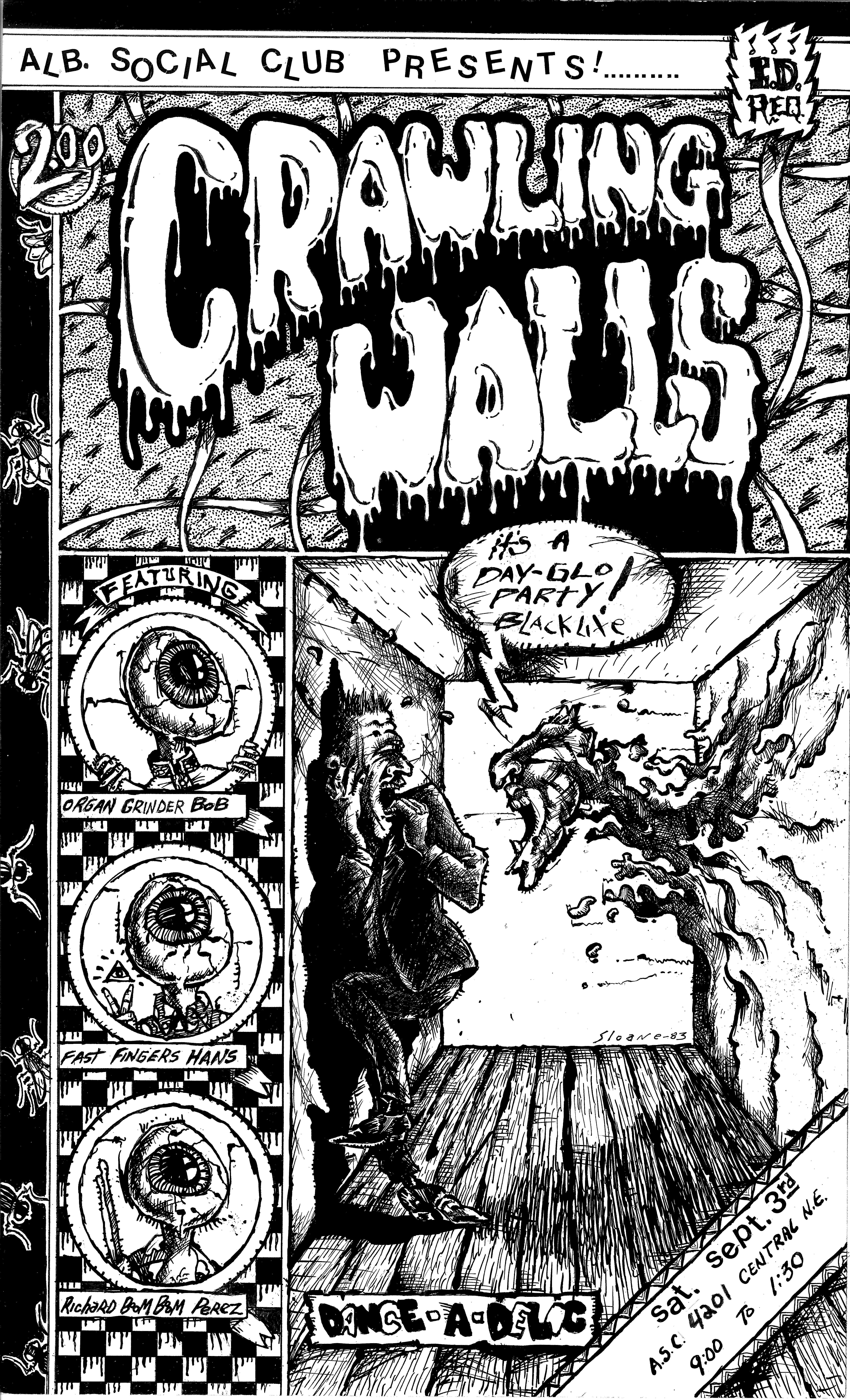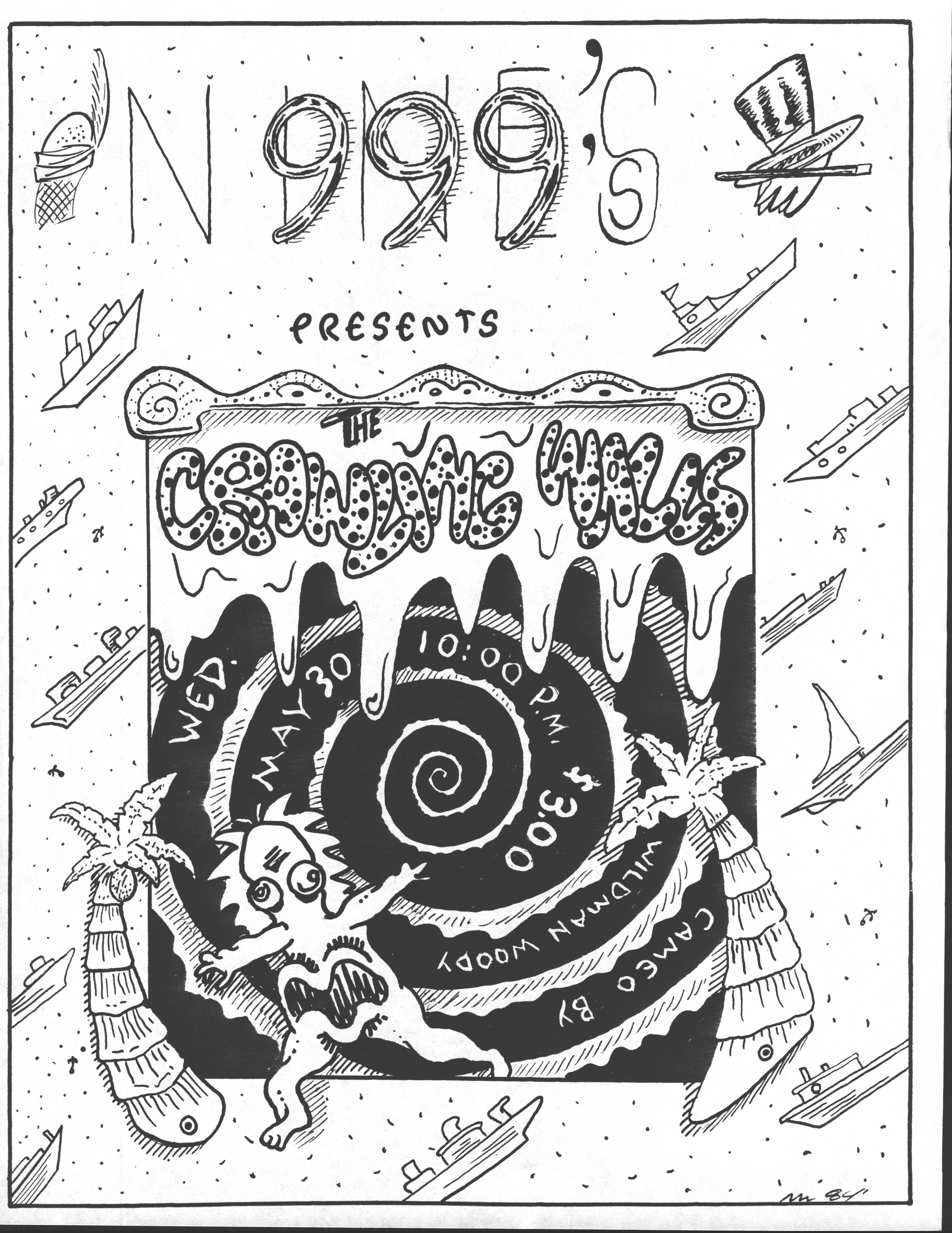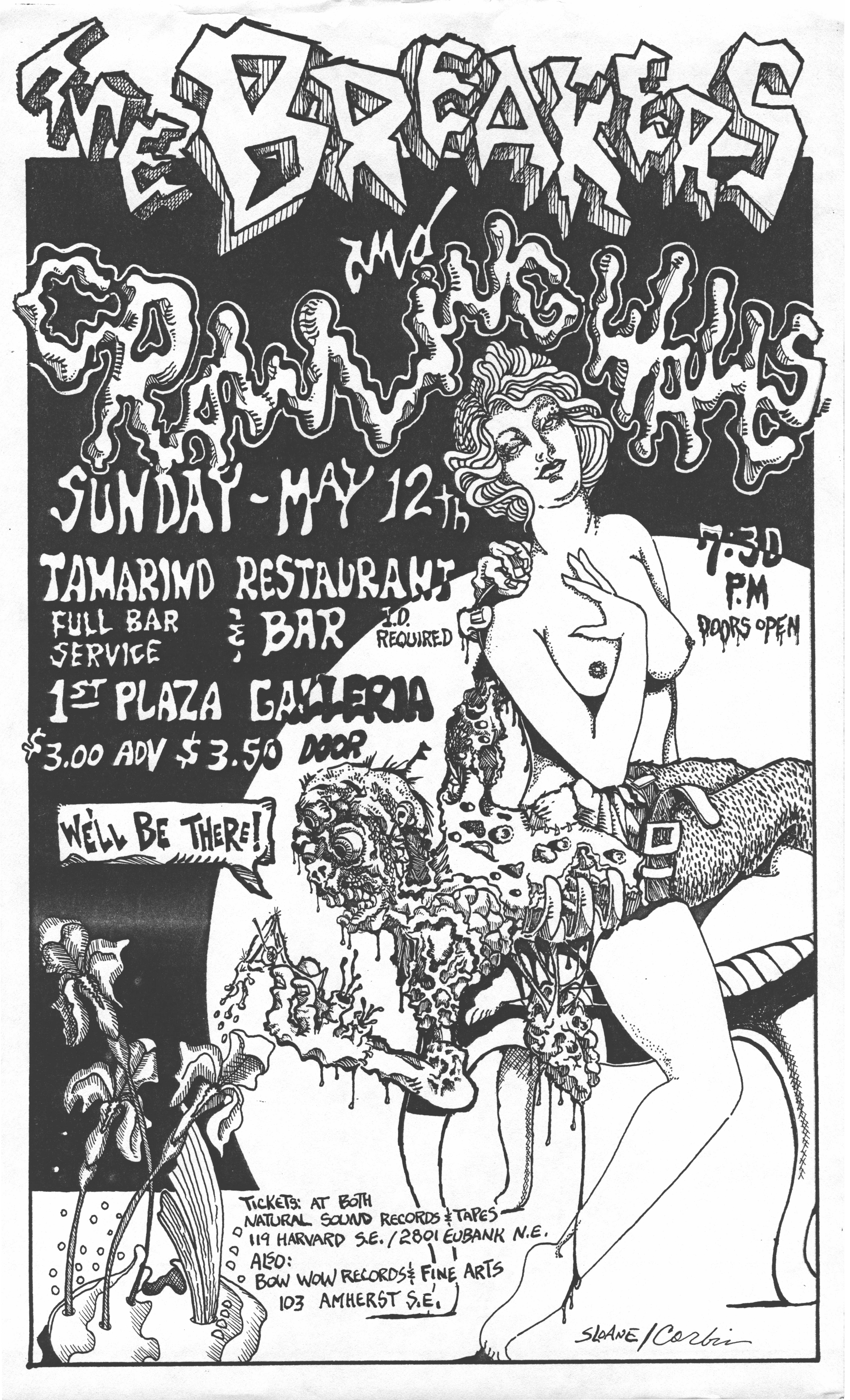 The show on October 20 with Plan 9 was one of the most memorable. They had left their home base in Rhode Island and were touring the country in a school bus that broke down in Kansas. They got it fixed and drove 12 hours straight, arriving after the Albuquerque show had already begun. No matter. They got there, and they were great! Afterward, they parked the bus in my driveway, and the 8 of them (they were touring with 4 guitars, bass, drums, keyboards, and vocals!) camped out at my house for a couple of days, long enough to stay for Hans' going-away party. They were amazed at the poster art that R.K. Sloane had done, and invited him to do the cover for "Dealing with the Dead," the album that they were working on, which pretty much launched Sloane's new career doing album art. He created cover art for 2 other Plan 9 albums, as well as several of the "Battle of the Garages" compilations, Roky Erickson's 1986 "Evil Hook Wildlife" single, and many others, including the skull and guns logo for the Guns N' Roses "Use Your Illusion I" album.