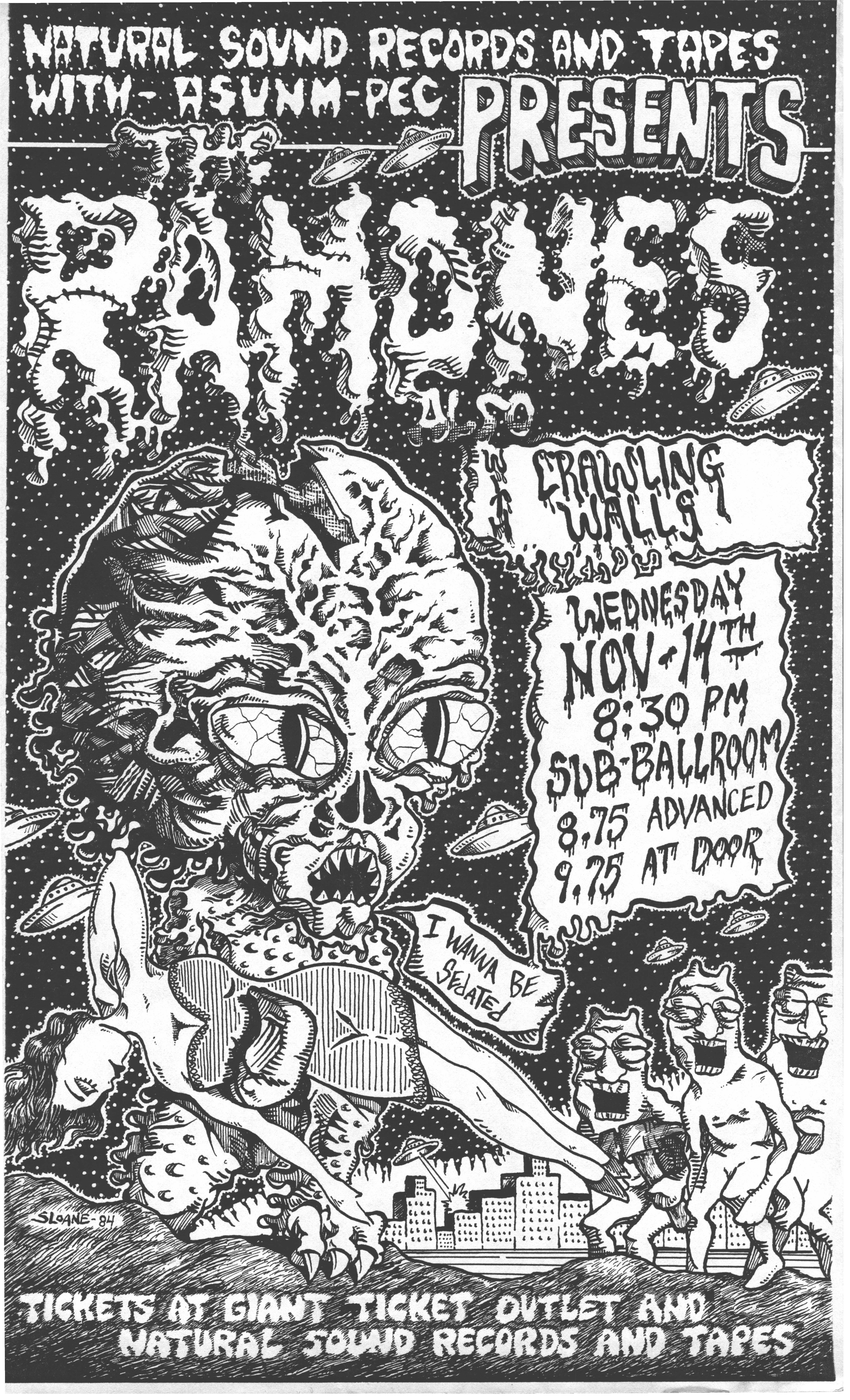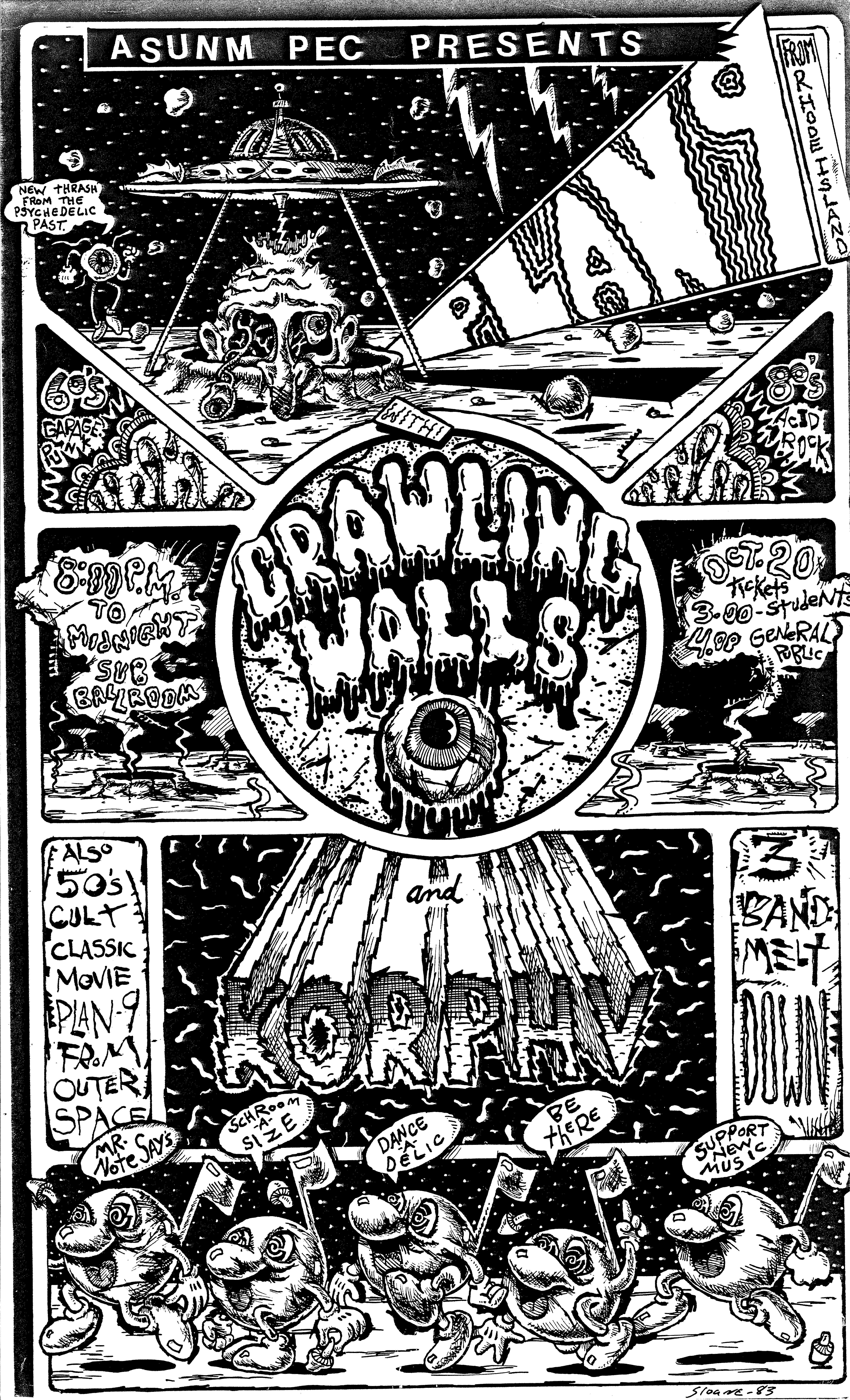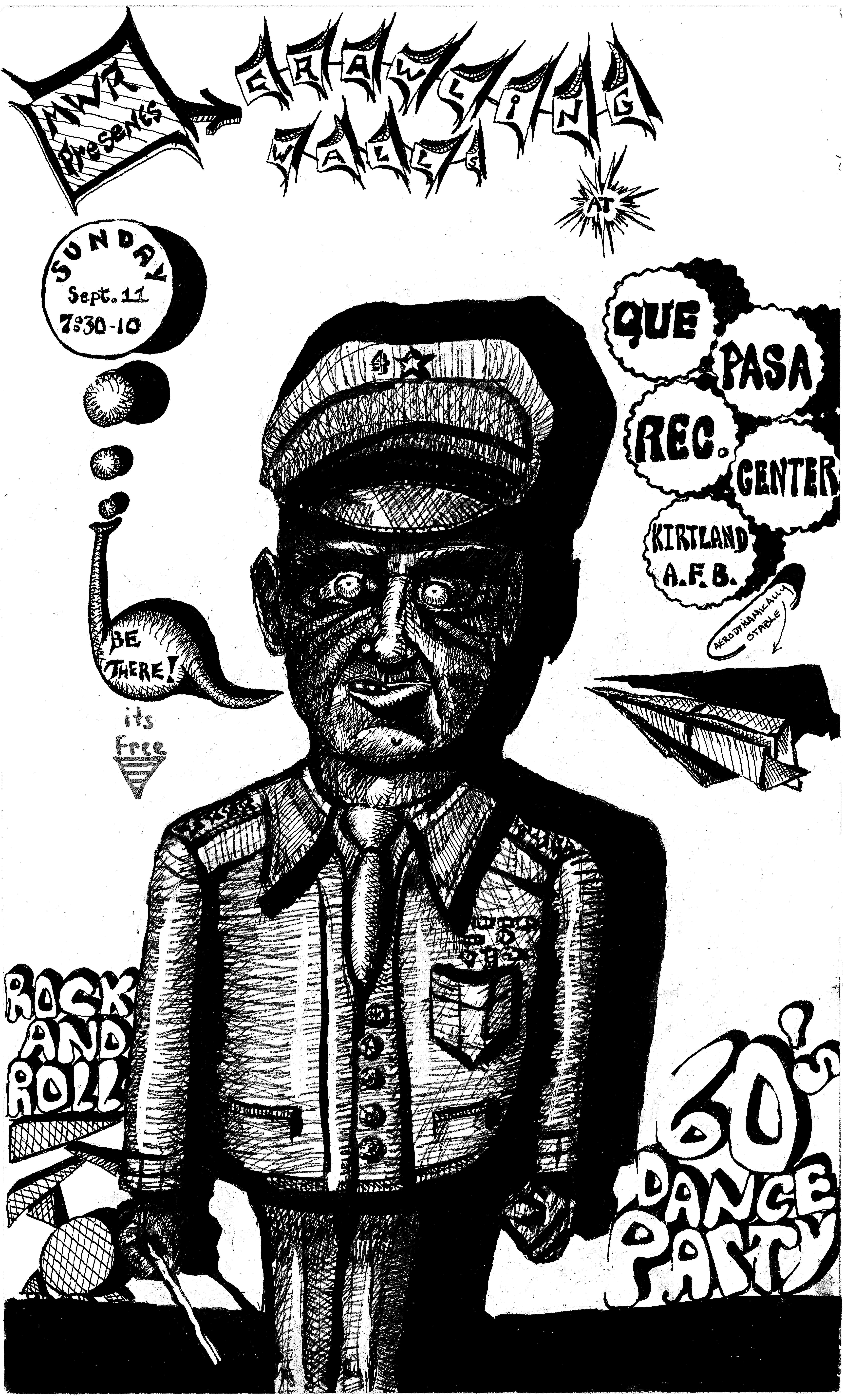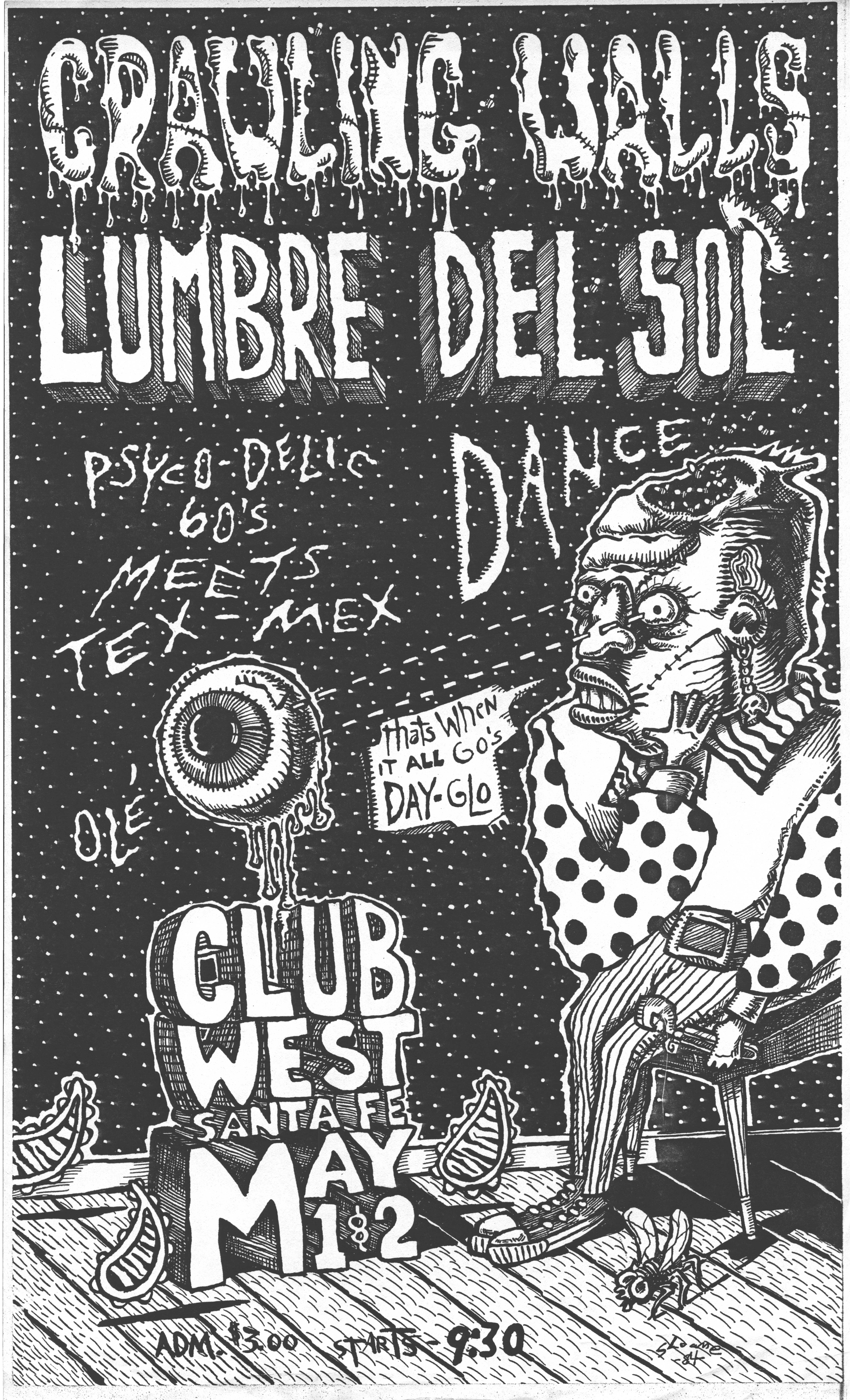 The show on October 20 with Plan 9 was one of the most memorable. They had left their home base in Rhode Island and were touring the country in a school bus that broke down in Kansas. They got it fixed and drove 12 hours straight, arriving after the Albuquerque show had already begun. No matter. They got there, and they were great! Afterward, they parked the bus in my driveway, and the 8 of them (they were touring with 4 guitars, bass, drums, keyboards, and vocals!) camped out at my house for a couple of days, long enough to stay for Hans' going-away party. They were amazed at the poster art that R.K. Sloane had done, and invited him to do the cover for "Dealing with the Dead," the album that they were working on, which pretty much launched Sloane's new career doing album art. He created cover art for 2 other Plan 9 albums, as well as several of the "Battle of the Garages" compilations, Roky Erickson's 1986 "Evil Hook Wildlife" single, and many others, including the skull and guns logo for the Guns N' Roses "Use Your Illusion I" album.