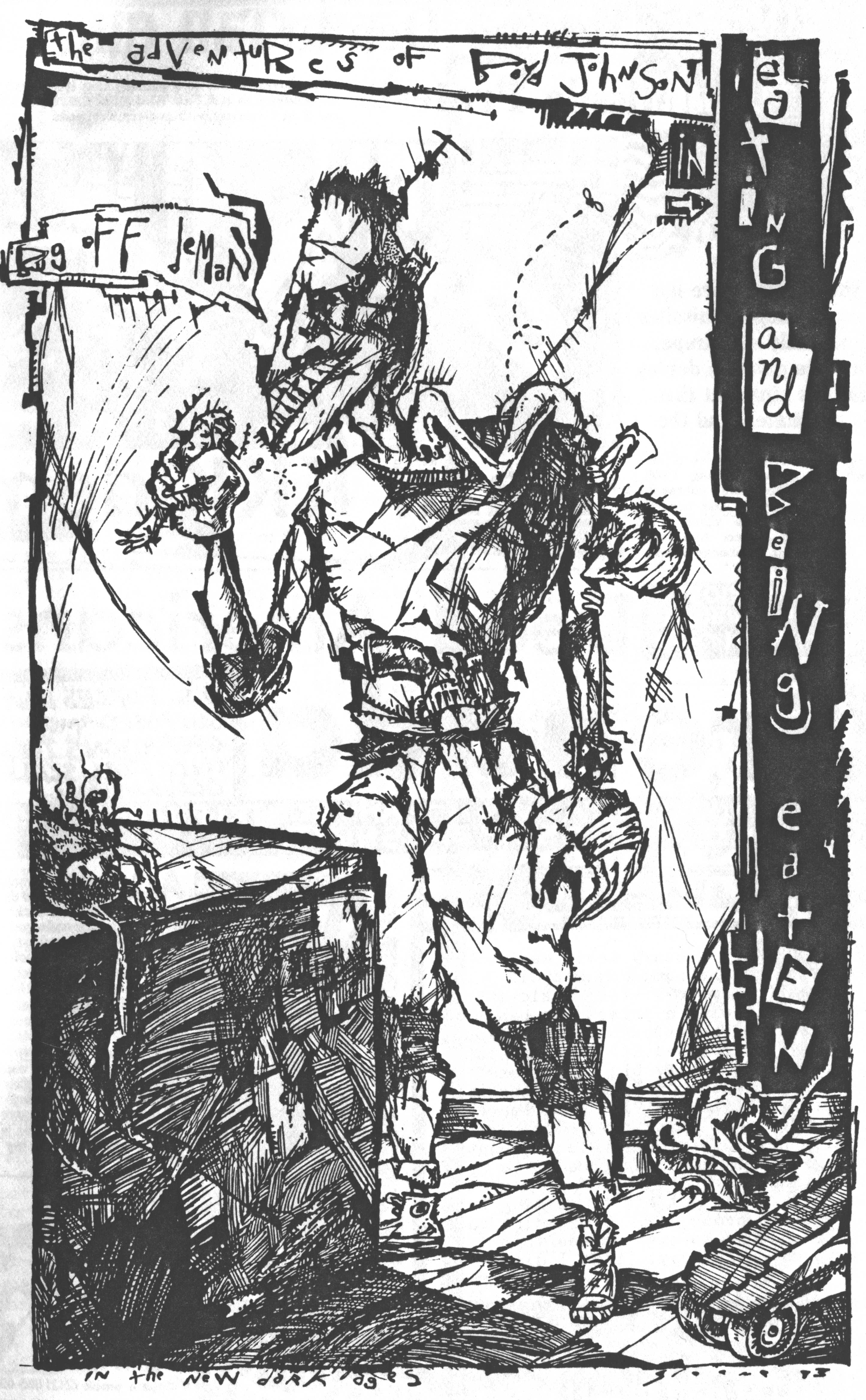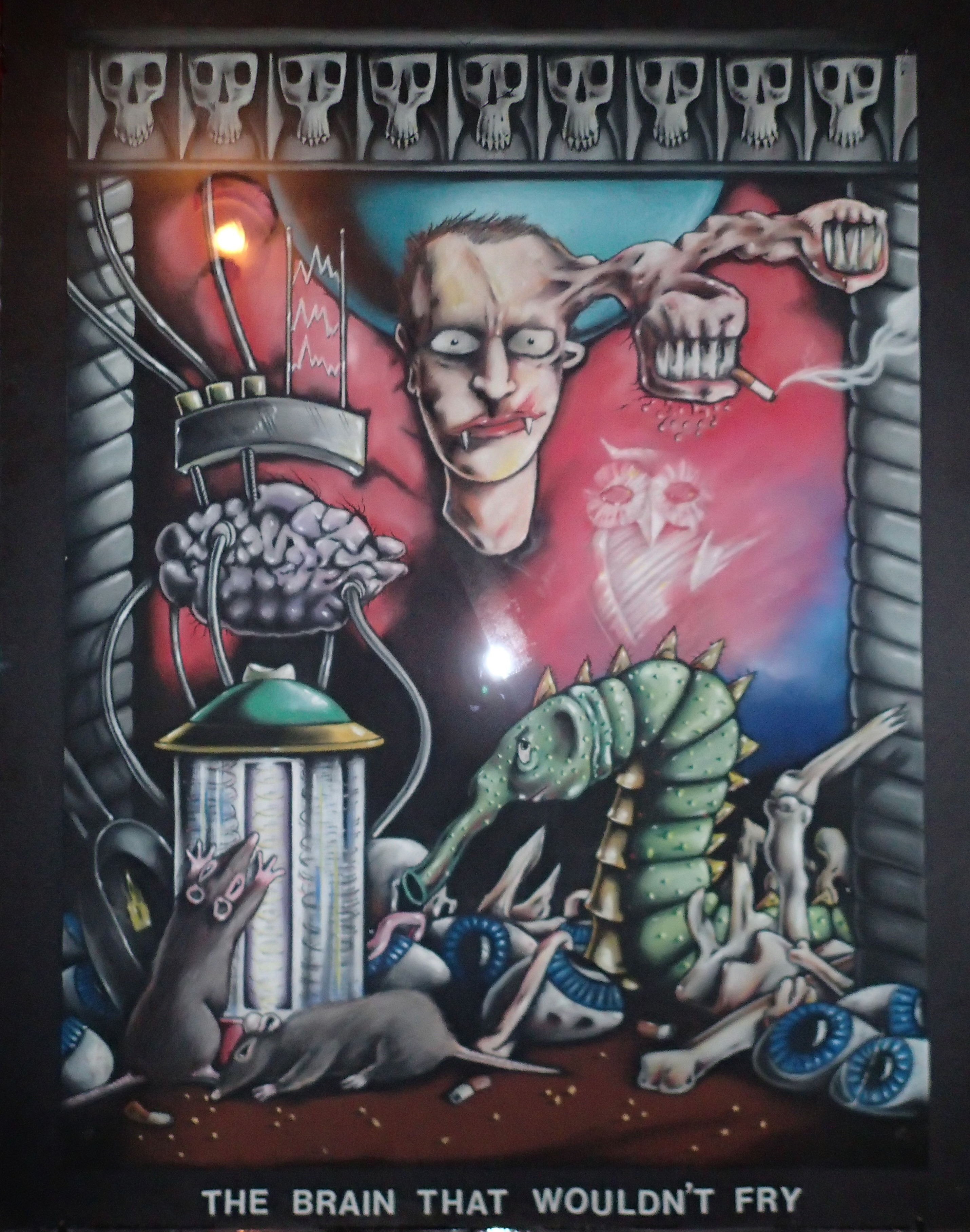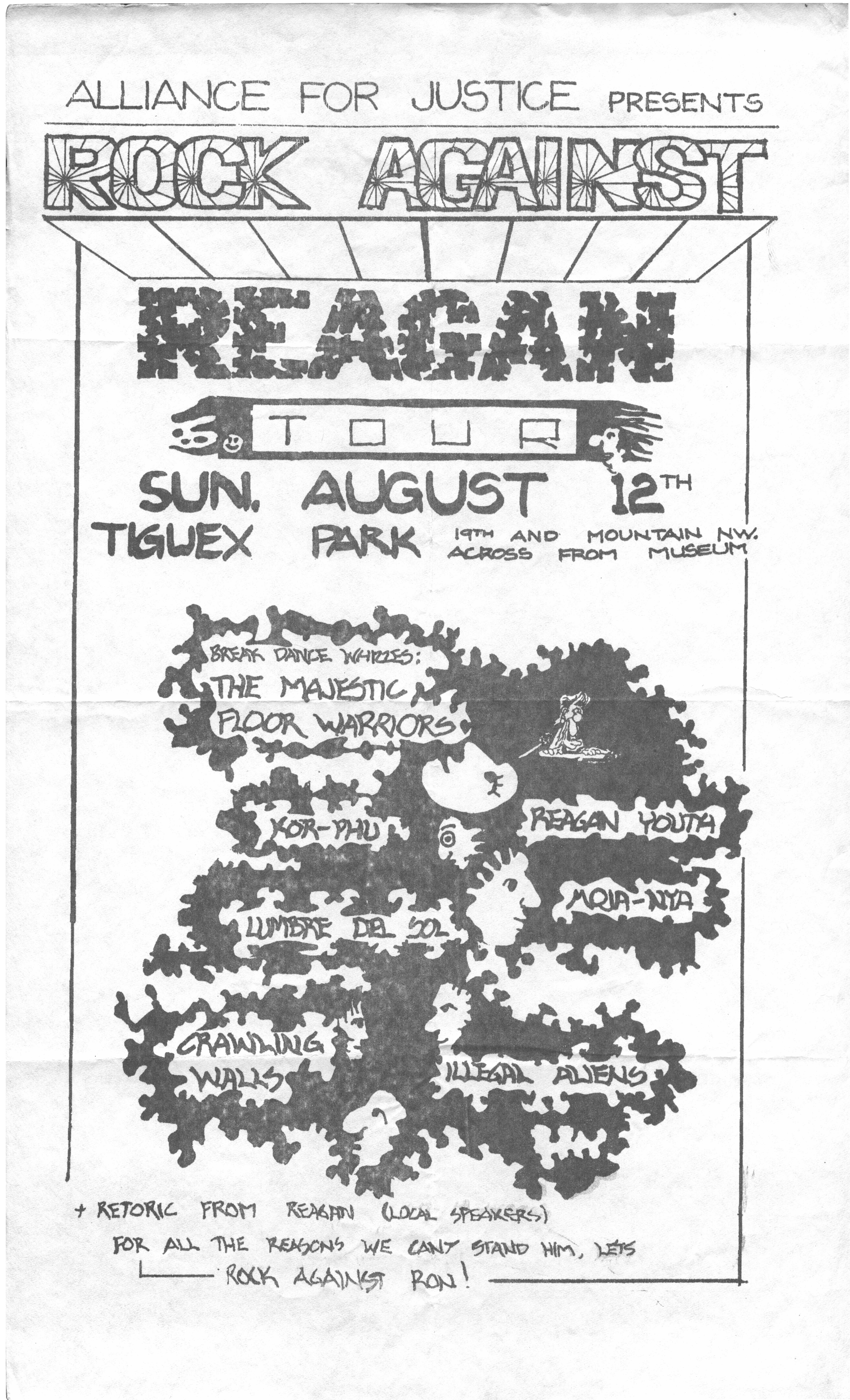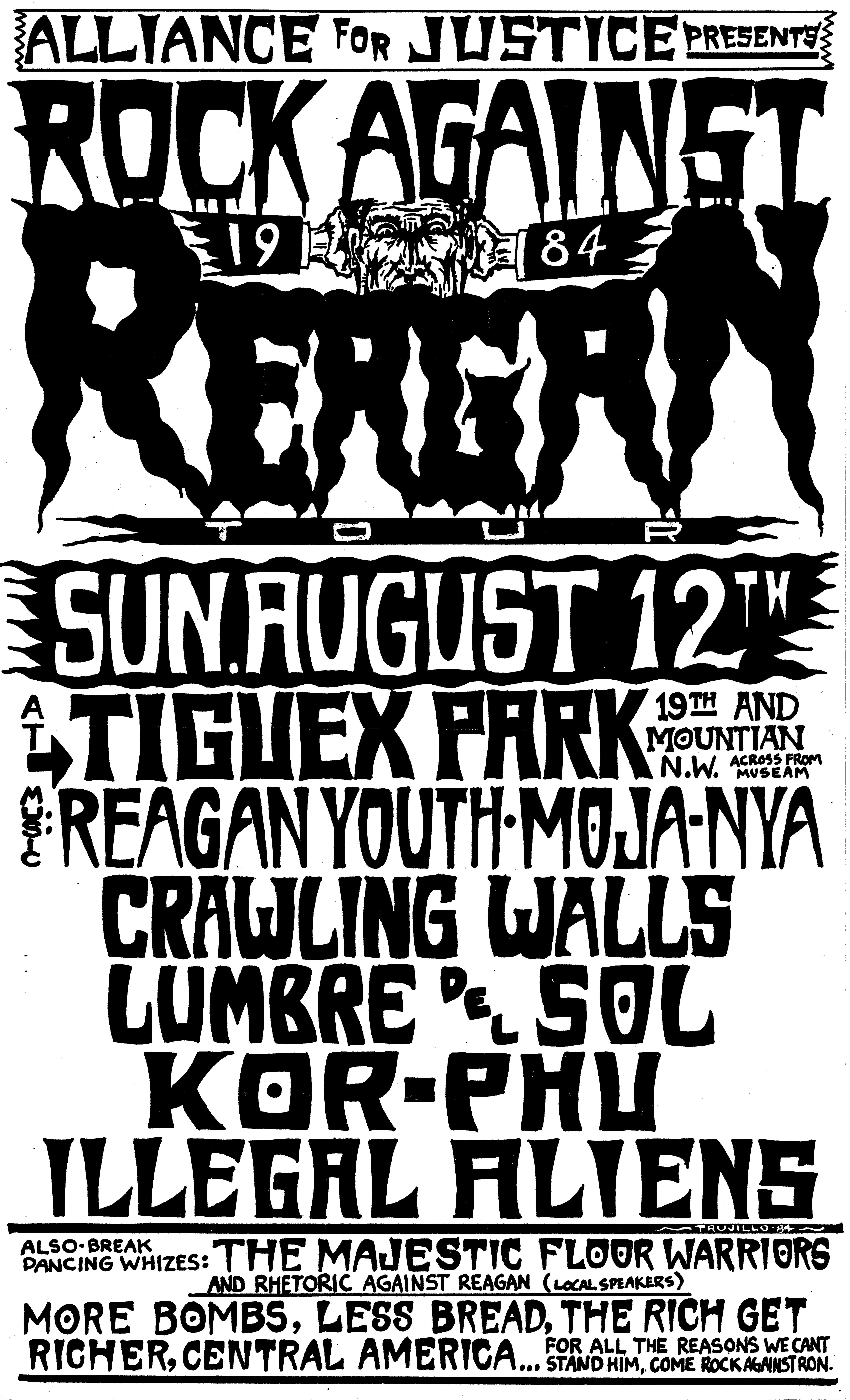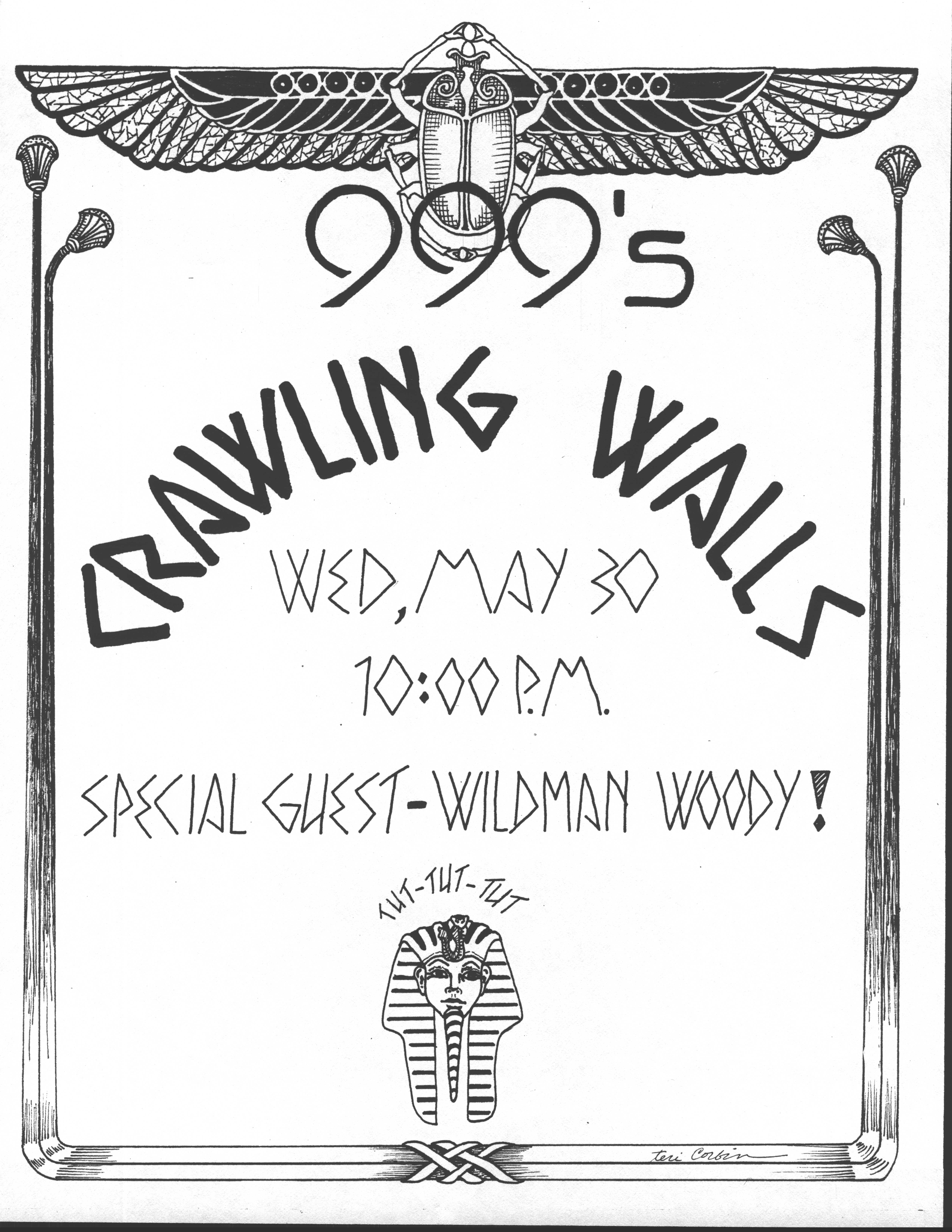 The show on October 20 with Plan 9 was one of the most memorable. They had left their home base in Rhode Island and were touring the country in a school bus that broke down in Kansas. They got it fixed and drove 12 hours straight, arriving after the Albuquerque show had already begun. No matter. They got there, and they were great! Afterward, they parked the bus in my driveway, and the 8 of them (they were touring with 4 guitars, bass, drums, keyboards, and vocals!) camped out at my house for a couple of days, long enough to stay for Hans' going-away party. They were amazed at the poster art that R.K. Sloane had done, and invited him to do the cover for "Dealing with the Dead," the album that they were working on, which pretty much launched Sloane's new career doing album art. He created cover art for 2 other Plan 9 albums, as well as several of the "Battle of the Garages" compilations, Roky Erickson's 1986 "Evil Hook Wildlife" single, and many others, including the skull and guns logo for the Guns N' Roses "Use Your Illusion I" album.